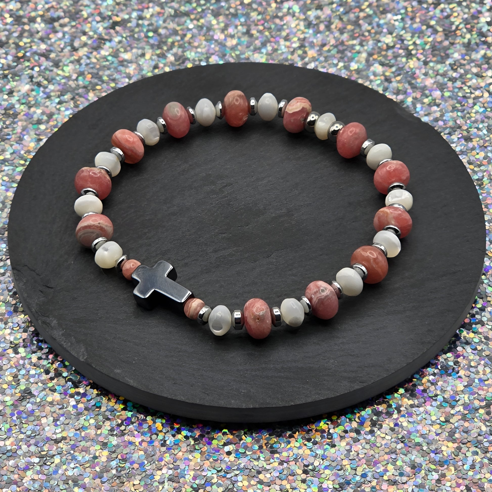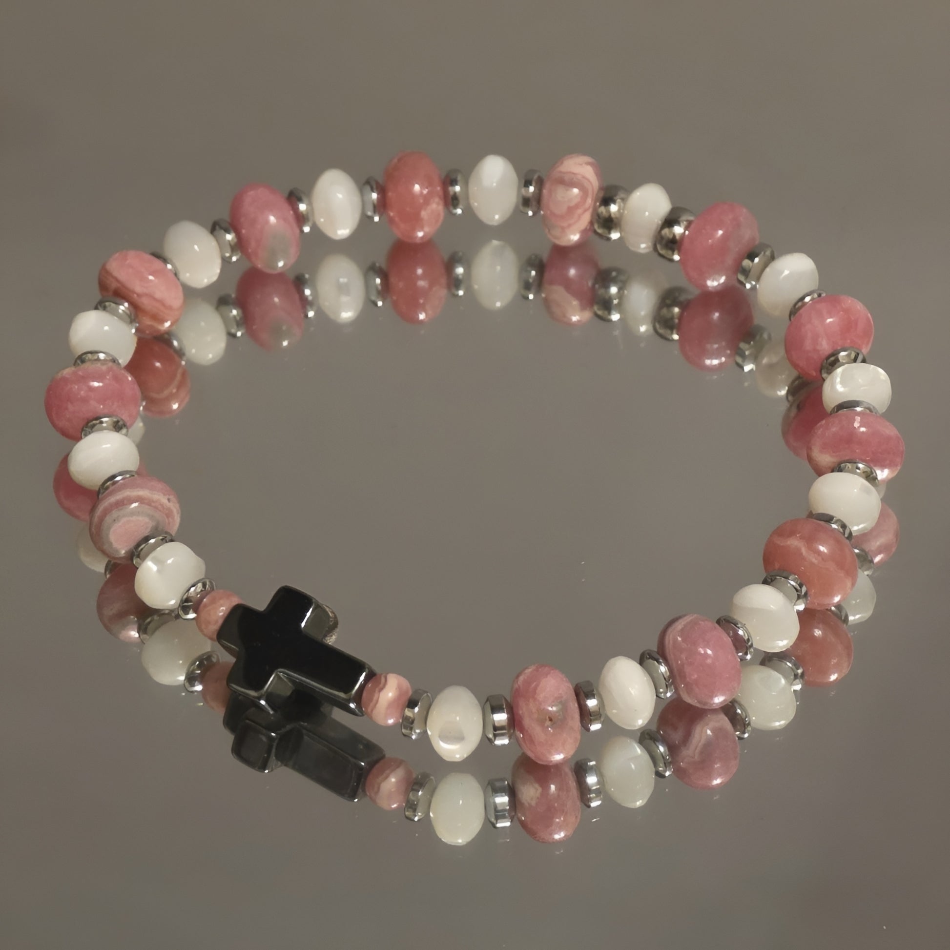 Das Armband „Helene“ vereint die warme, herzöffnende Energie des Rhodochrosits mit der sanften, schützenden Ausstrahlung von Perlmutt. Es wirkt wie ein liebevoller Atemzug für die Seele – weich, lebendig und tief berührend.
