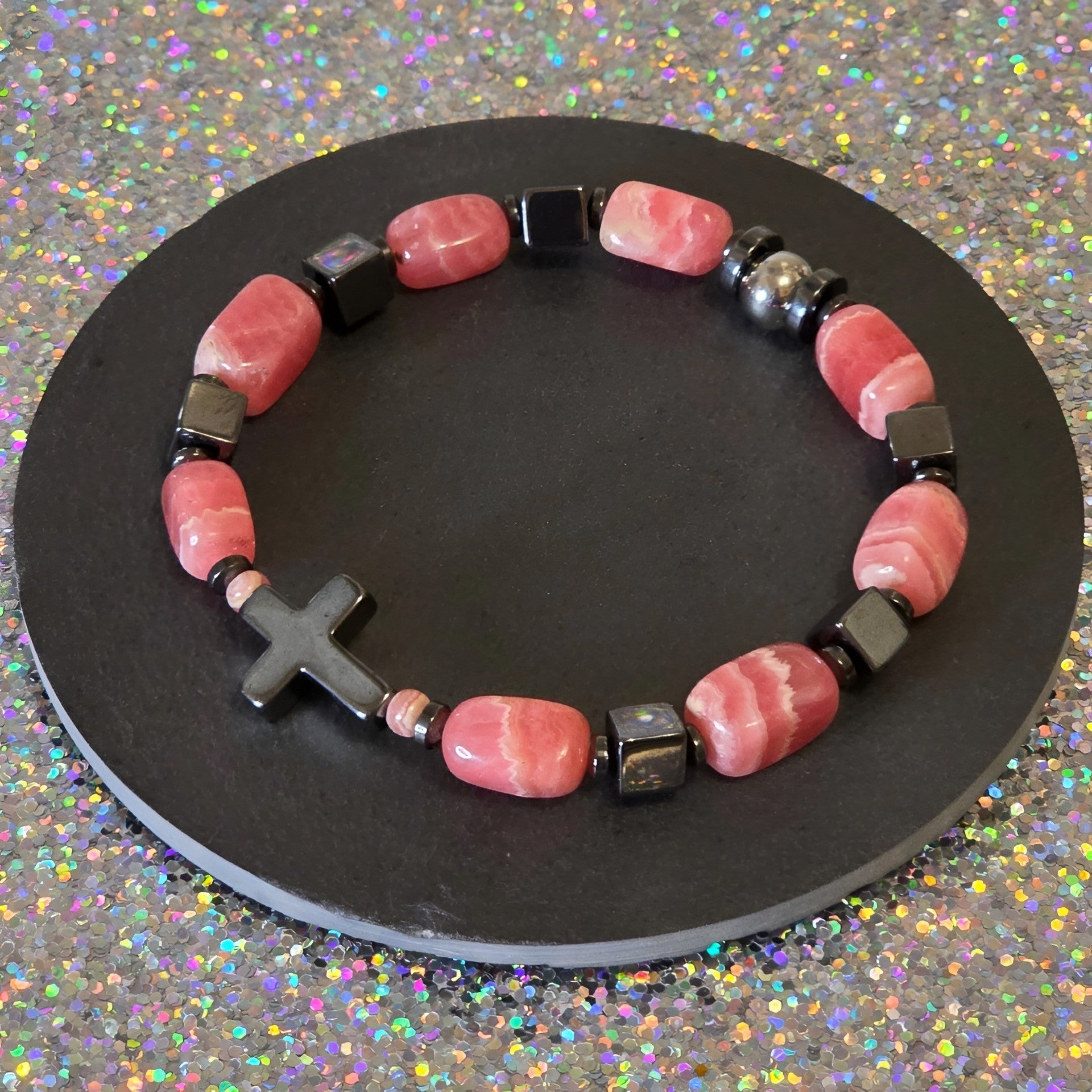 Das Armband „Flieger“ verbindet die herzöffnende, warme Energie des Rhodochrosits mit der stabilisierenden Kraft des Hämatits. Es steht für Lebendigkeit, Mut und die Freiheit, dem eigenen Herzen zu folgen.
