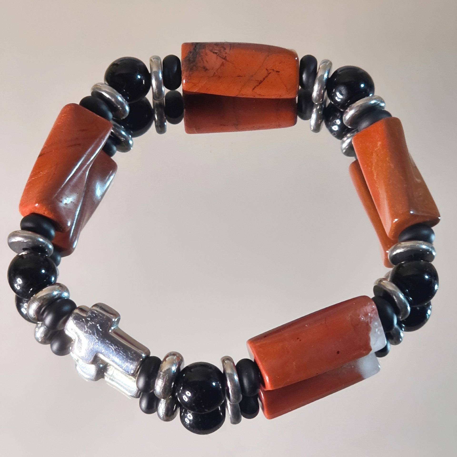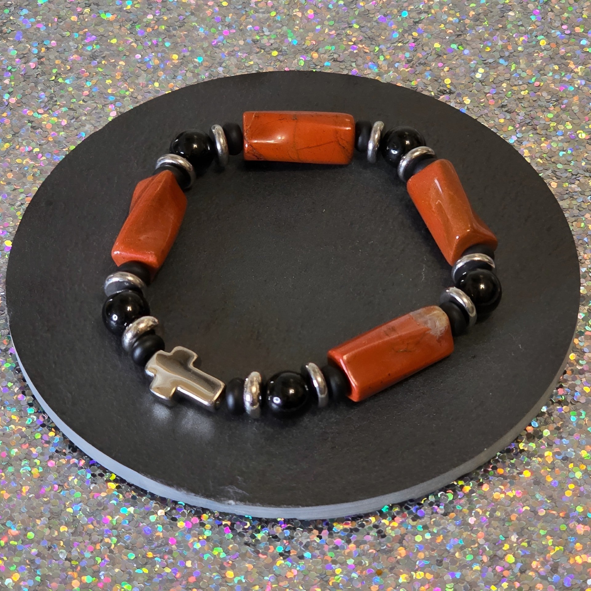 Das Kreuz in der Mitte symbolisiert Glauben, Vertrauen und Stärke – ein feines Detail, das dem Armband eine spirituelle Tiefe verleiht.