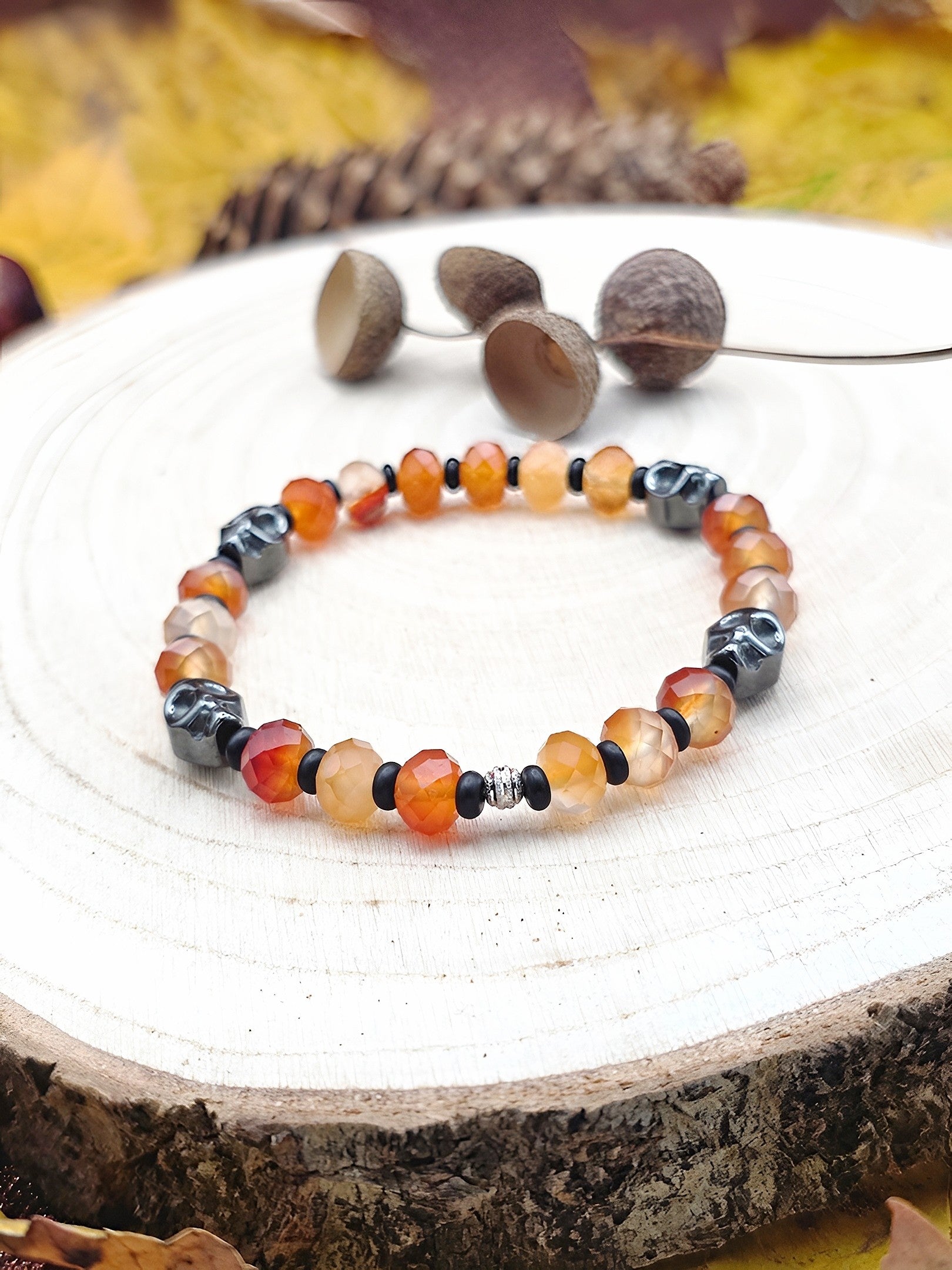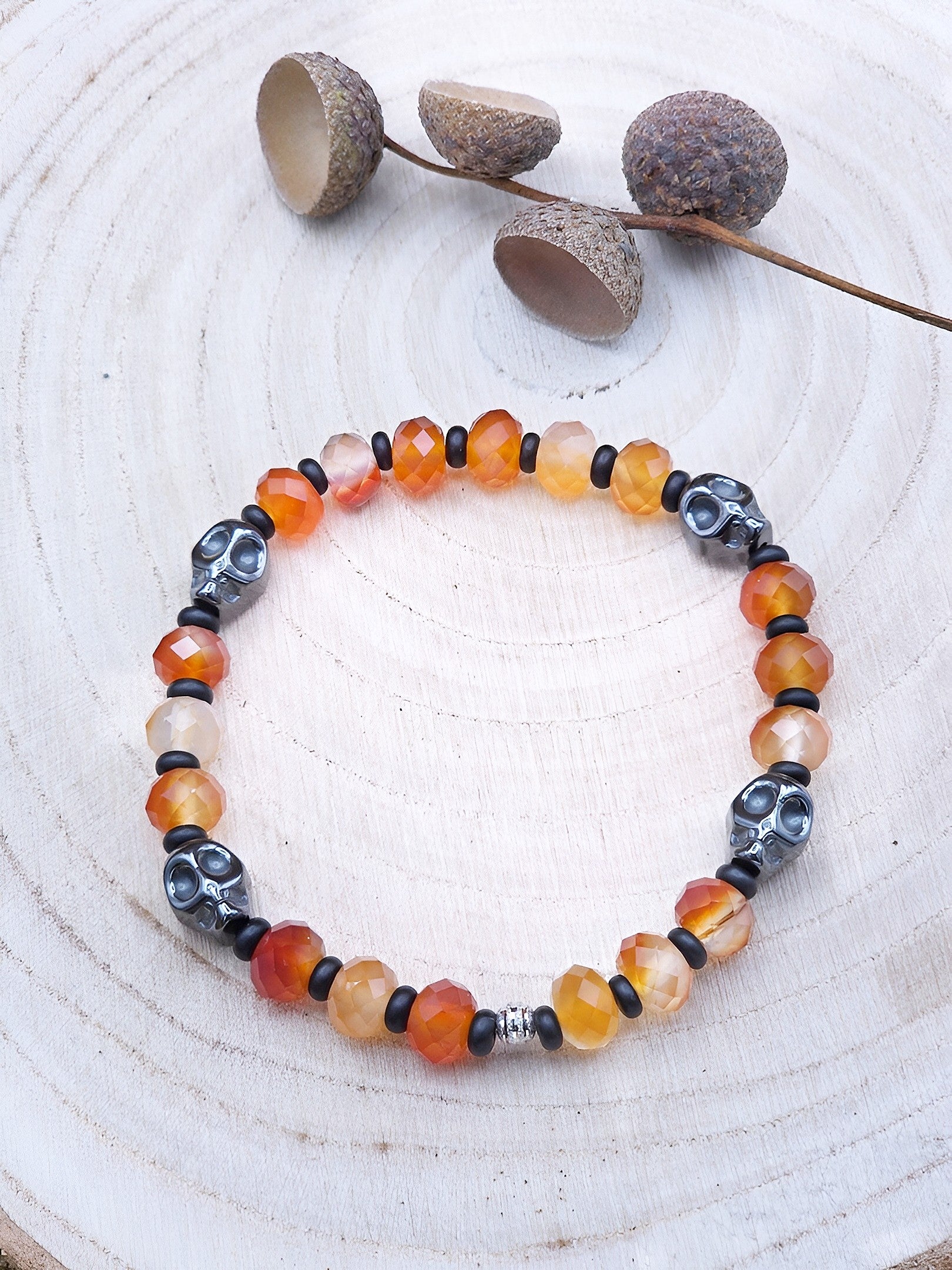 - Energie Armband Karneol, Armumfang ca. 18 cm, Länge ca. 19 cm, Gummiband, Karneol Button 6 mm, Totenköpfe aus Hämatit, Zwischenteile Hämatit