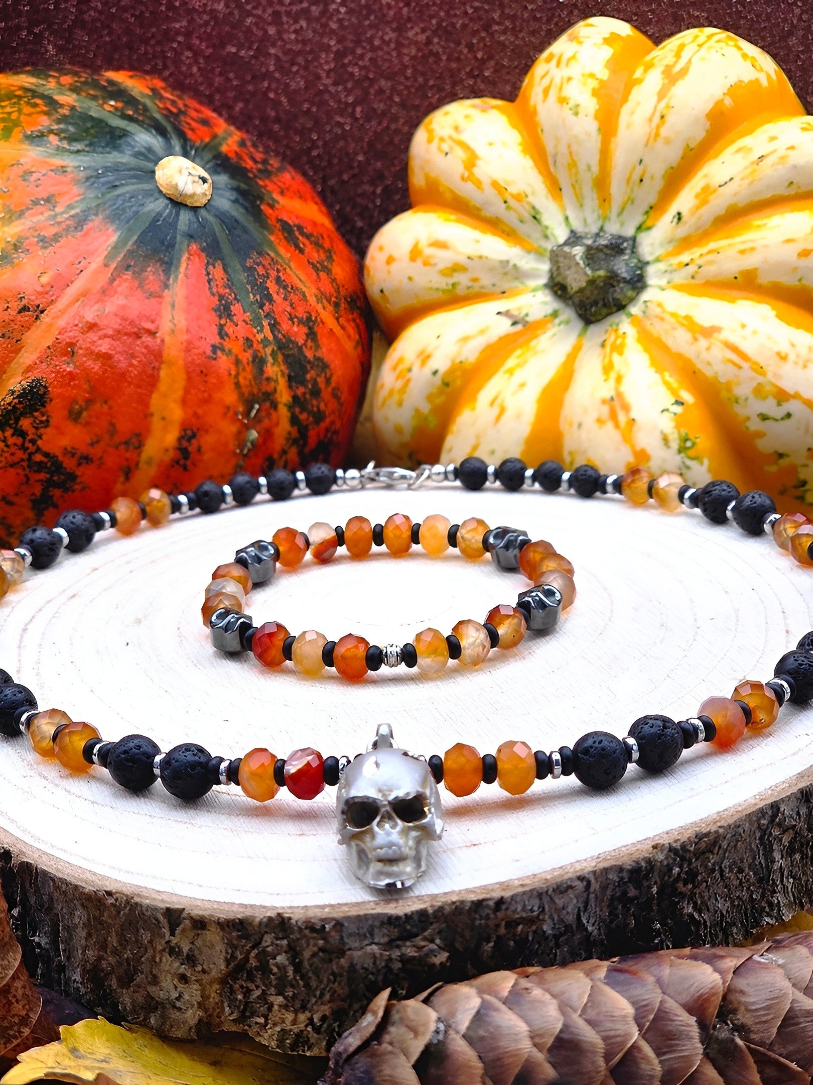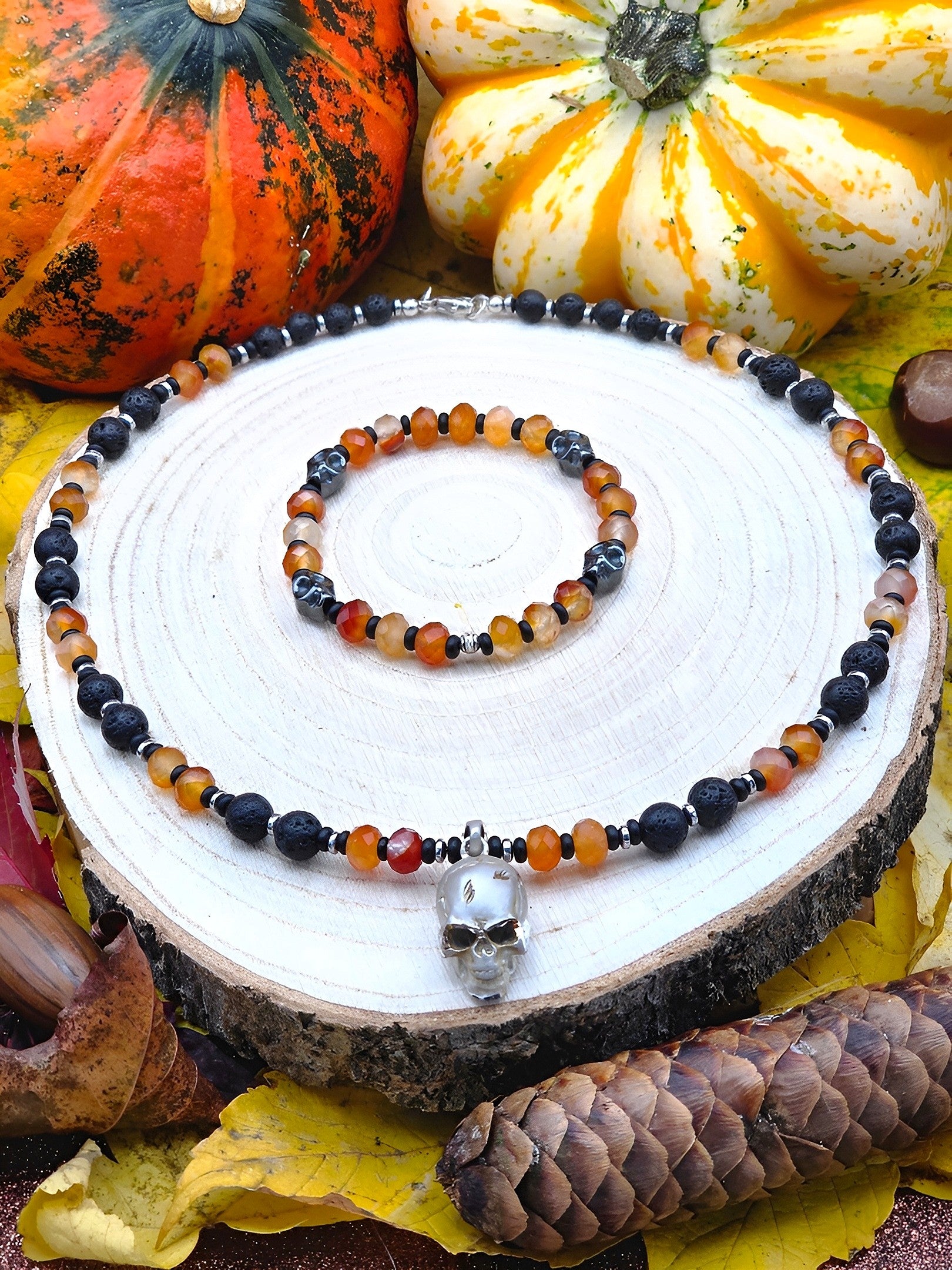 Karneol Totenkopf-Halskette und Armband mit Lavastein & Hämatit
